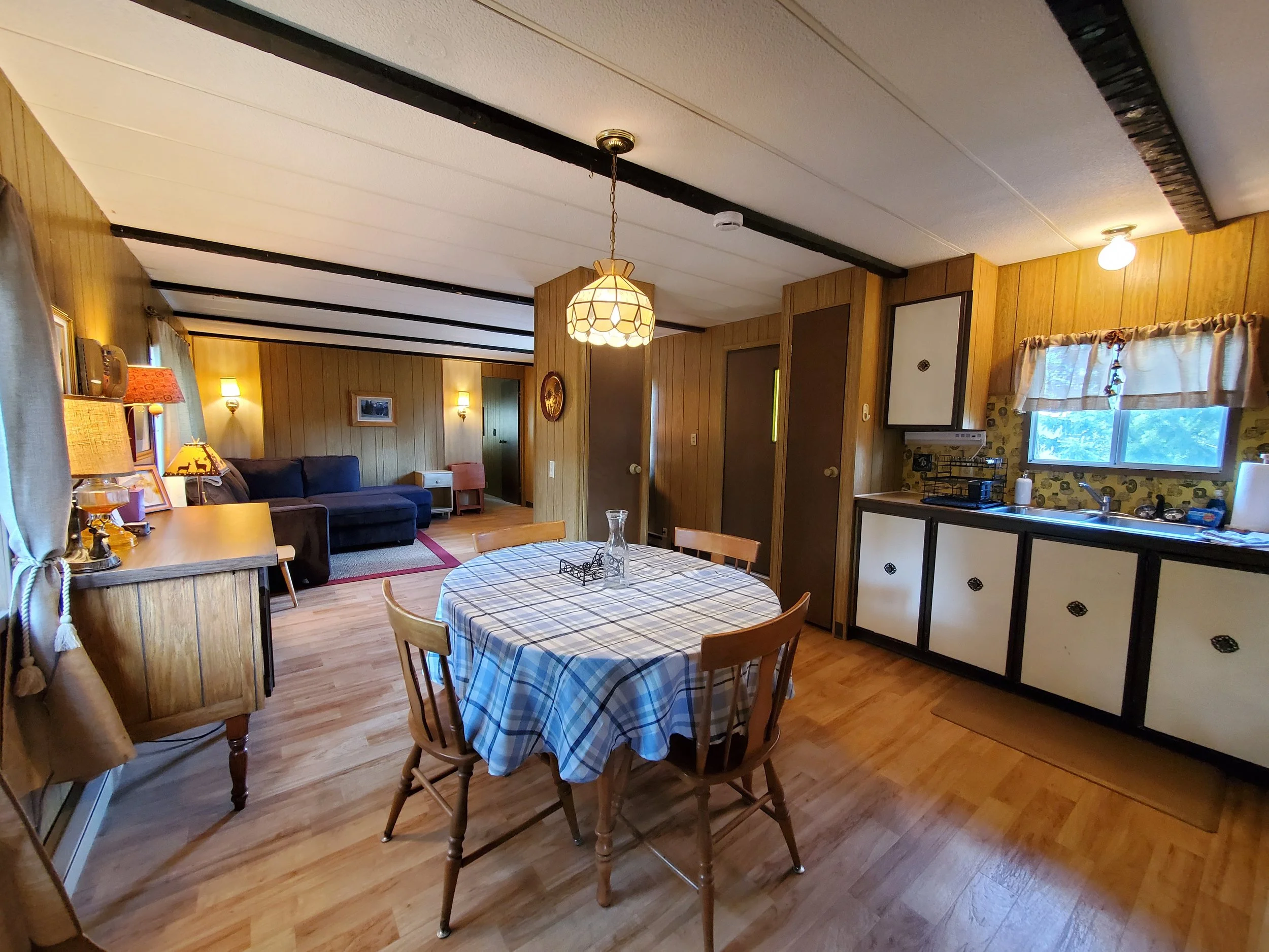 Comfortable lakeside trailer home with deck views, walk-to-town access, & partial dock access for summer fun & relaxation.