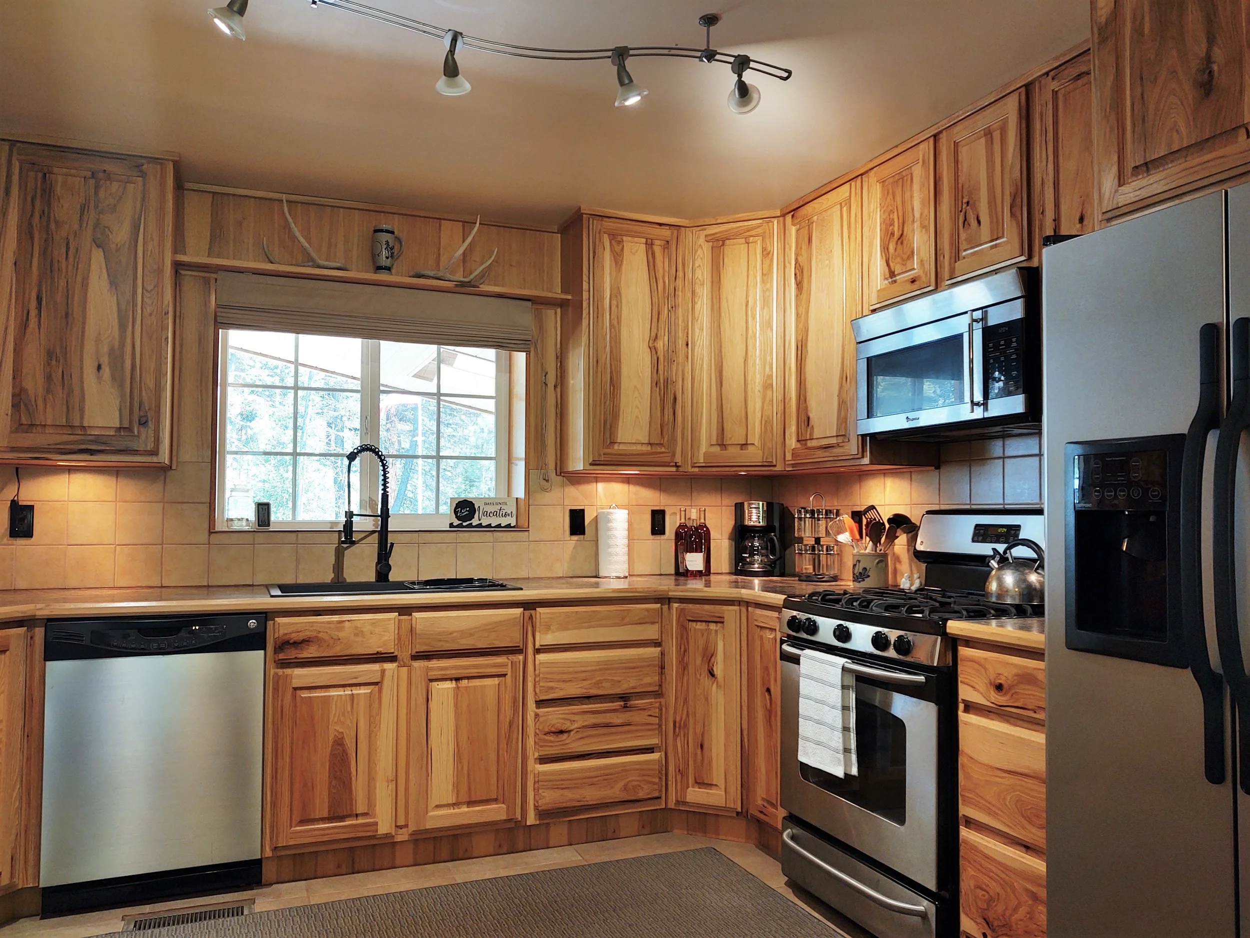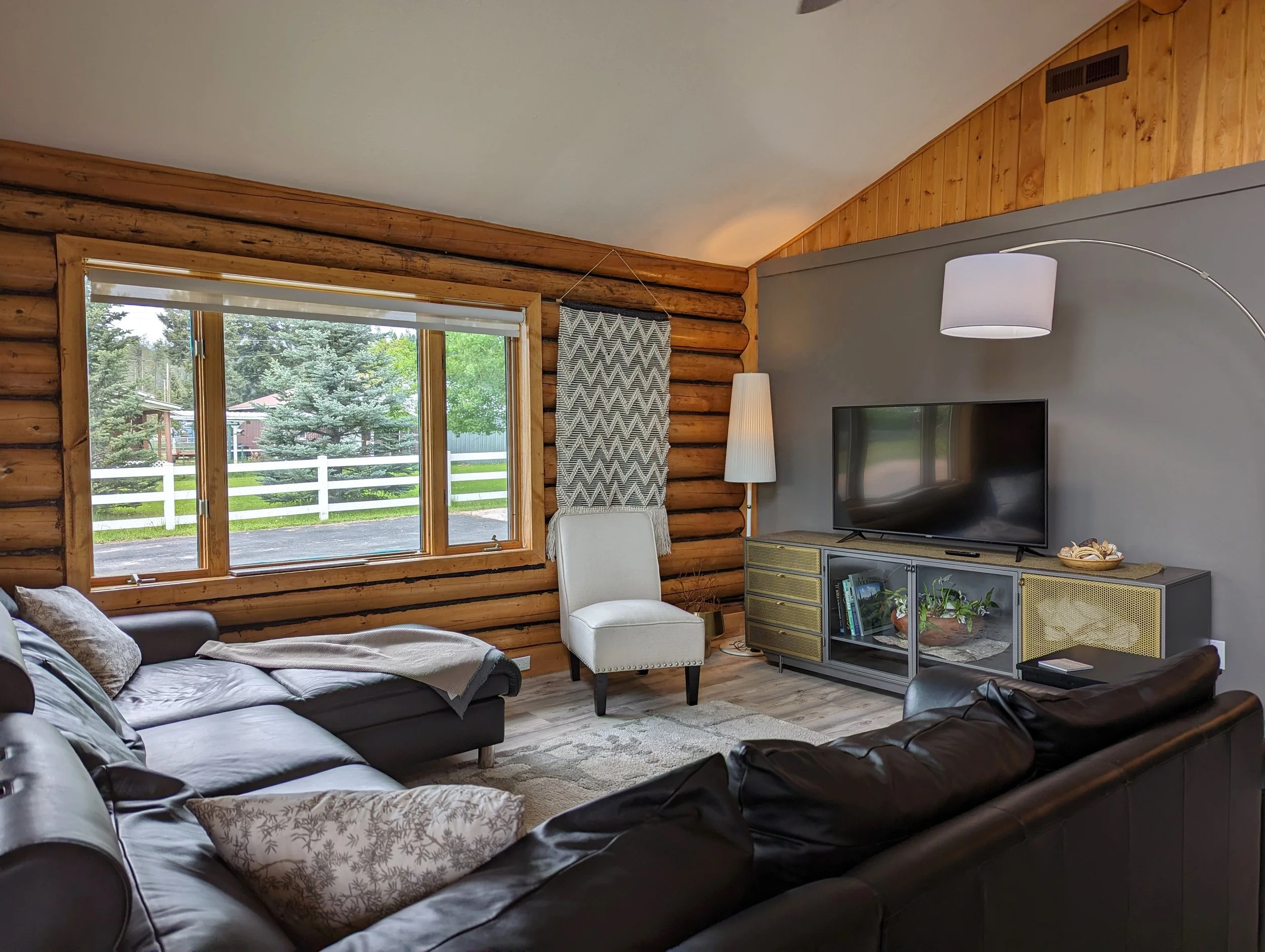 Rustic log home with two living areas, a full kitchen, fenced backyard, & a central location with quick access to shops & restaurants.